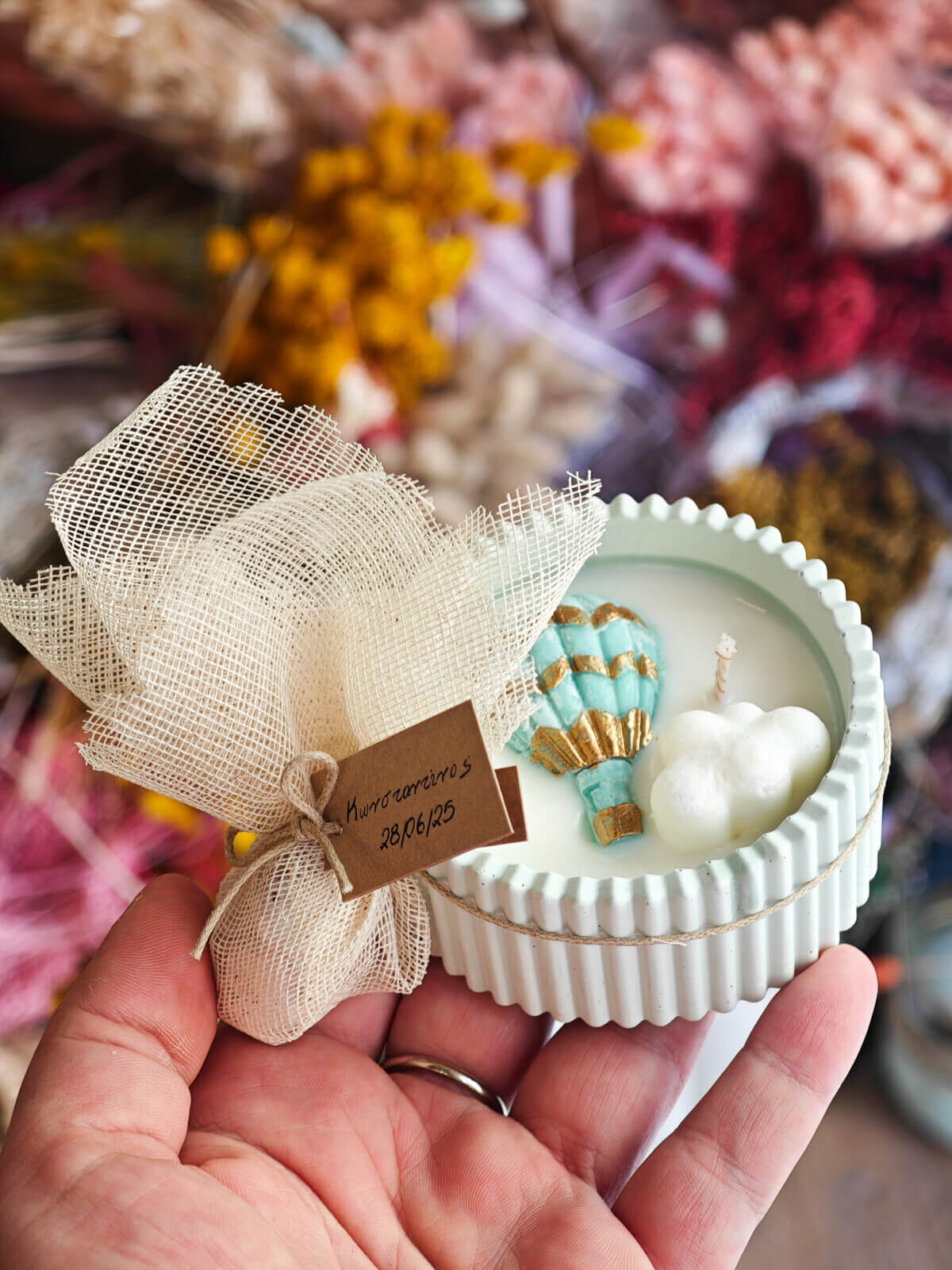 - φυτικό κερί από σόγια ,με αερόστατο και σύννεφο ,μέσα σε χειροποίητο Βαζάκι (8εκ) στα χρώματα της επιλογής σας (τα διαθέσιμα χρώματα υπάρχουν σε φωτογραφία)